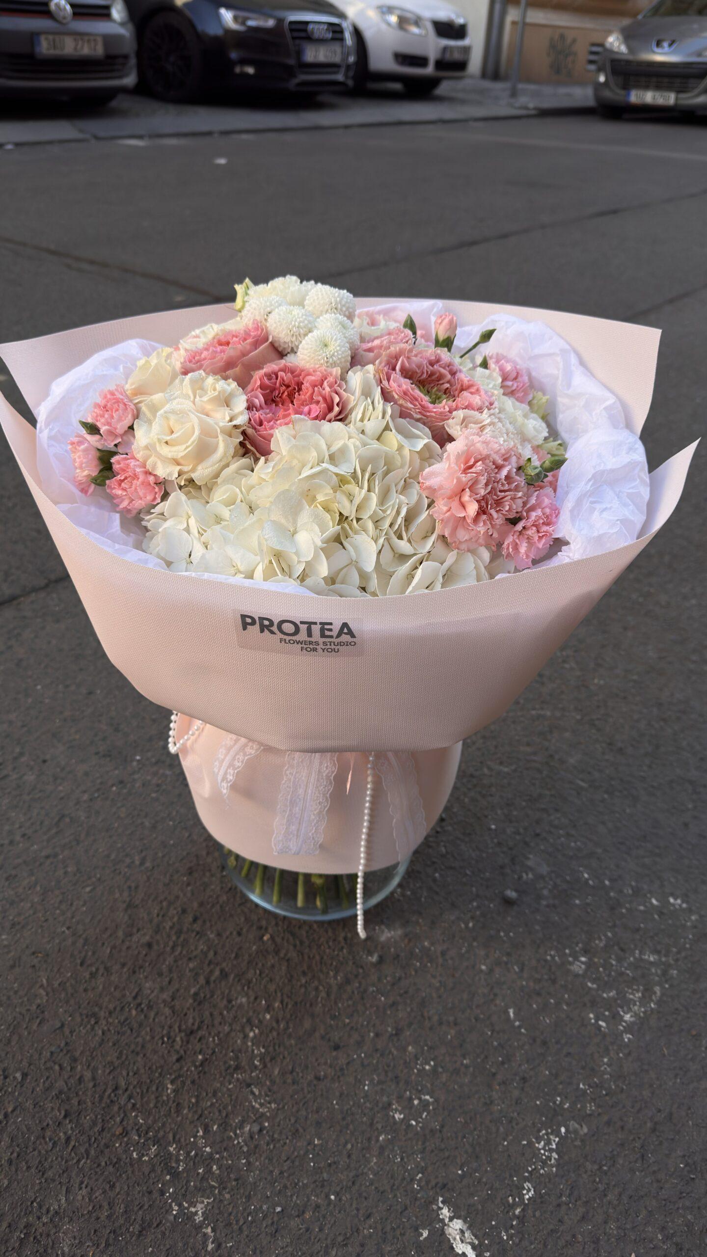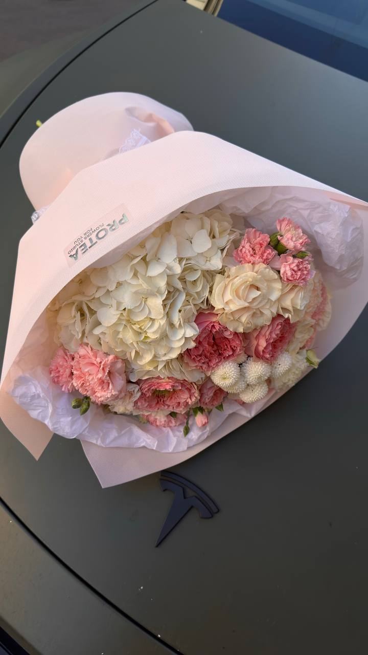 A sophisticated and voluminous bouquet featuring a large white hydrangea base, accented with layered pink garden roses, soft pink carnations, and petite white pompom chrysanthemums. The composition is balanced with delicate pink rosebuds, creating a romantic pastel palette of white and blush tones.