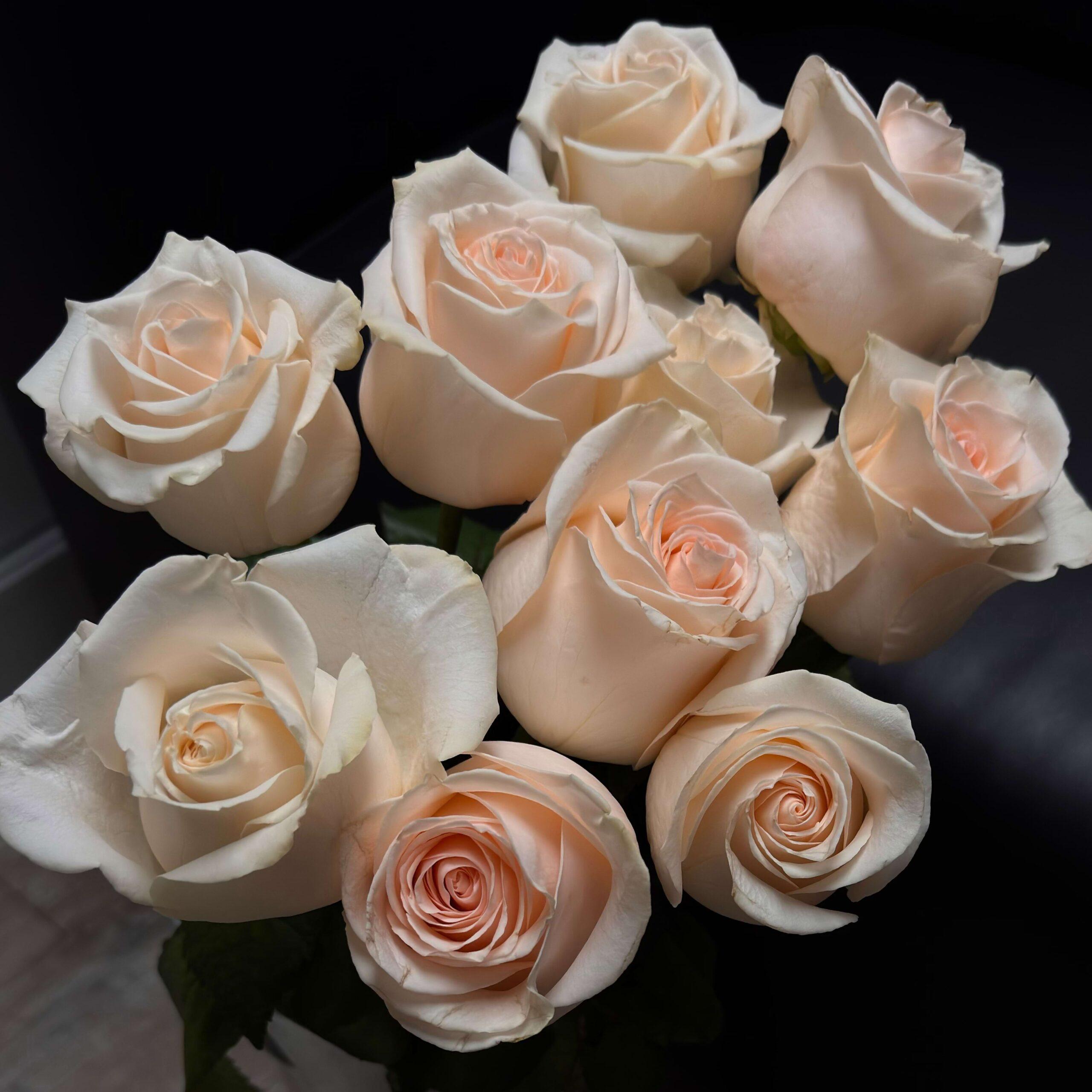 A sophisticated premium rose that enchants with its soft, porcelain-like appearance. The Carolina variety features large, elegant buds that open into a perfect classic shape with a delicate creamy-peach or pale apricot center. Its smooth, satin petals and gentle color transition make it a symbol of grace and understated luxury.