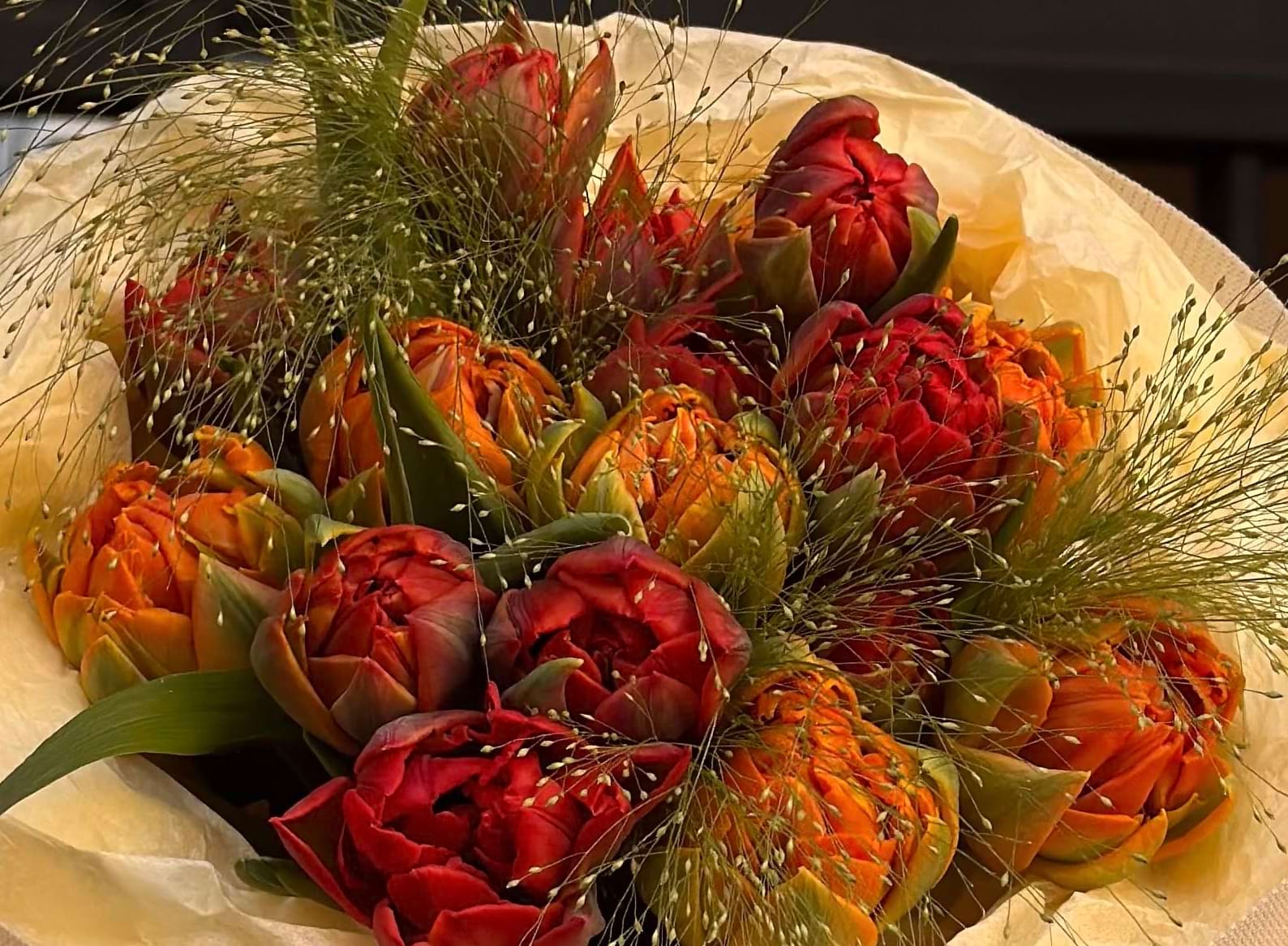 A vibrant and energetic bouquet featuring 17 premium double-layered tulips in a striking gradient of orange and deep red. These peony-style tulips are accented with delicate wisps of decorative panicum grass, which adds a light, airy texture to the dense, fiery blooms. The price is based on an arrangement of 17 stems.