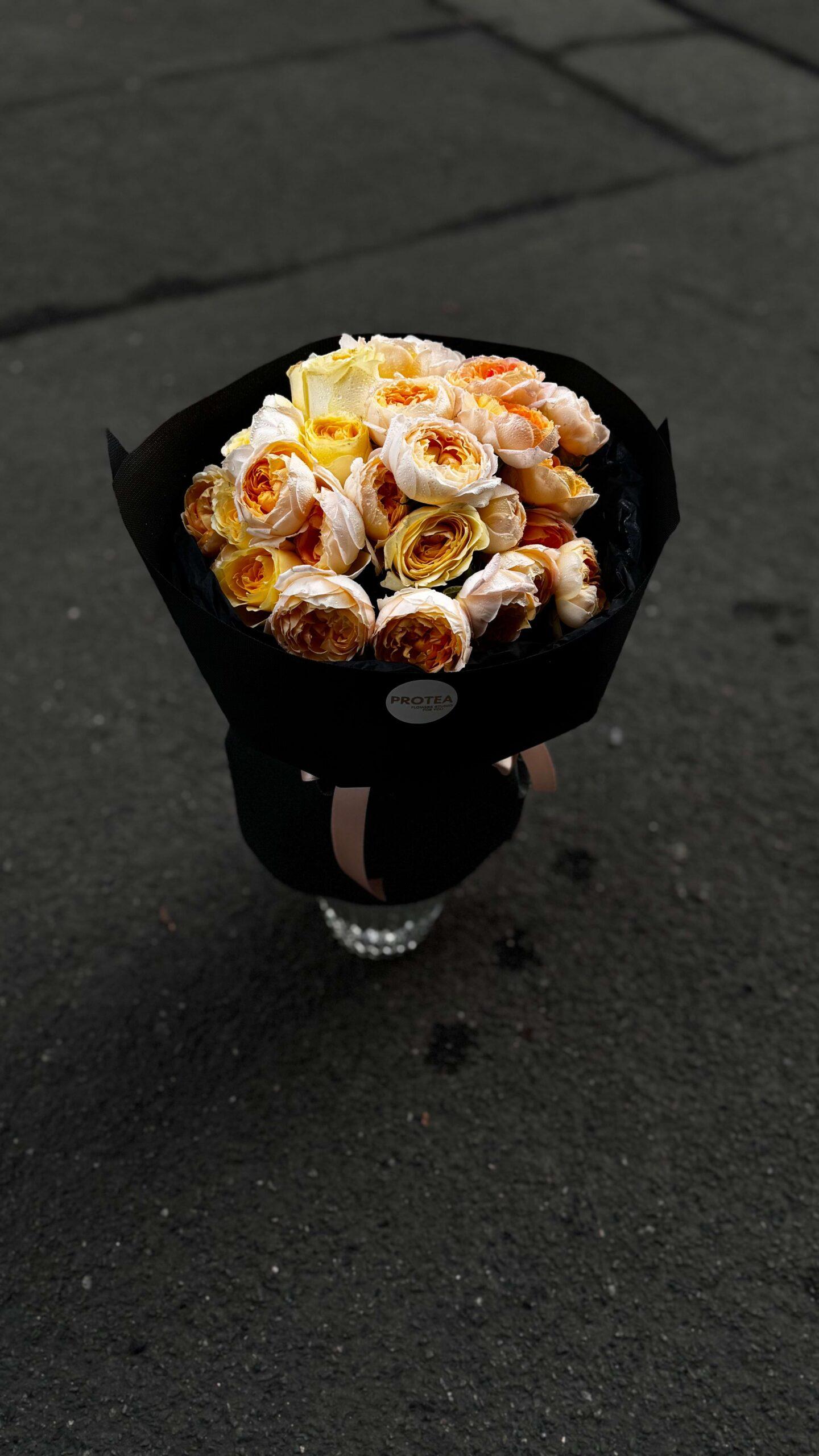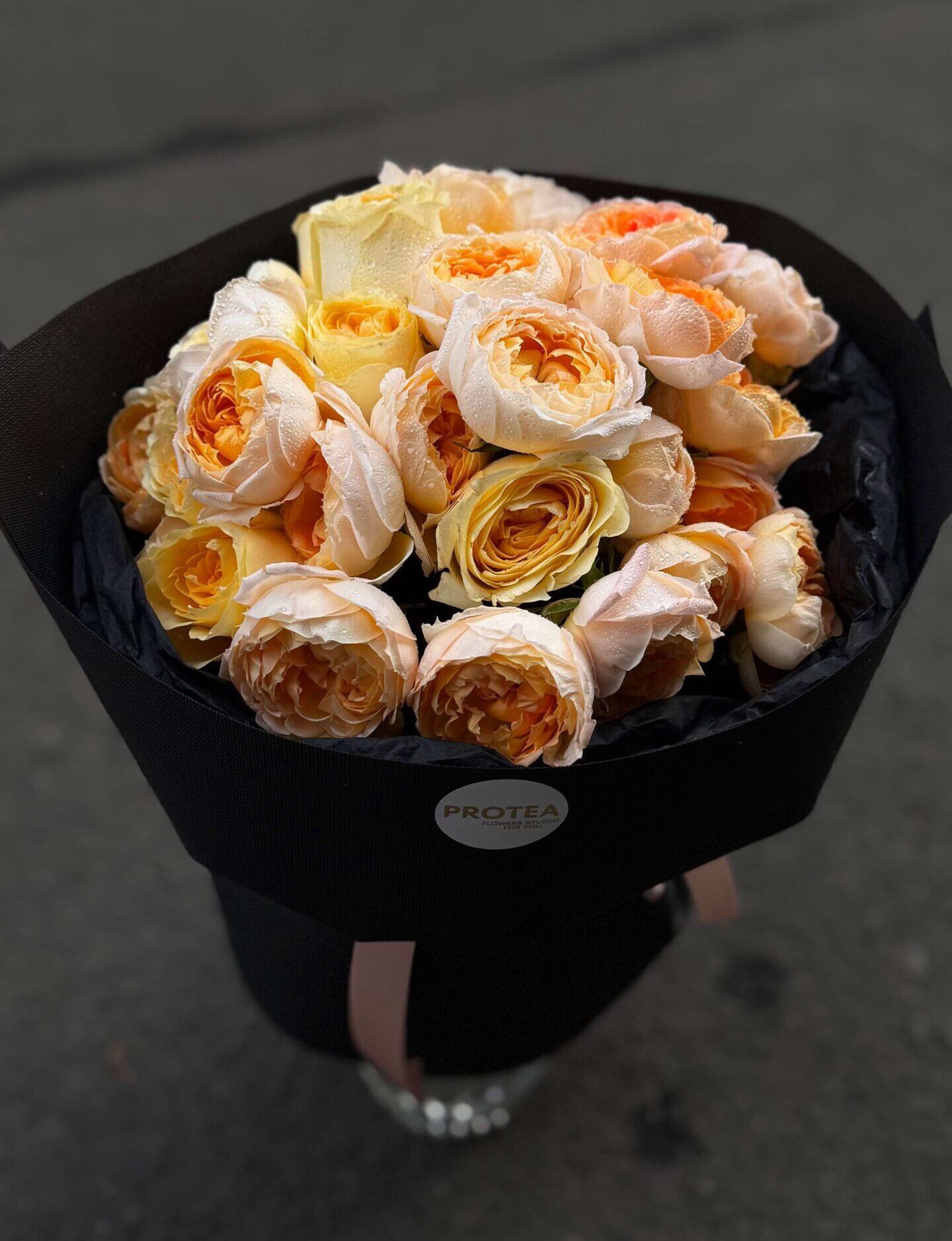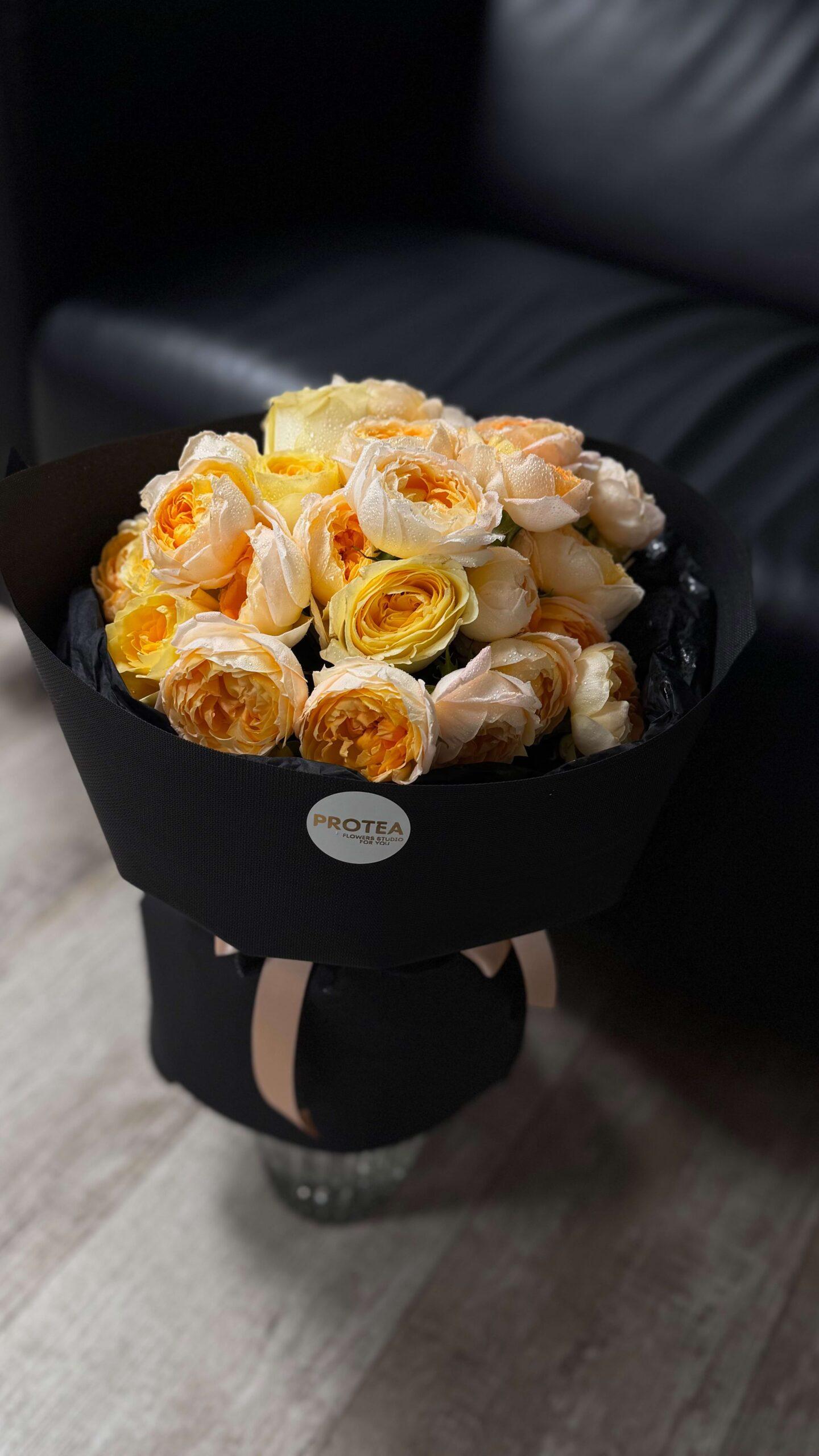 Expertly wrapped in PROTEA’s signature elegant black paper to emphasize the bright, sunny hues of the roses.