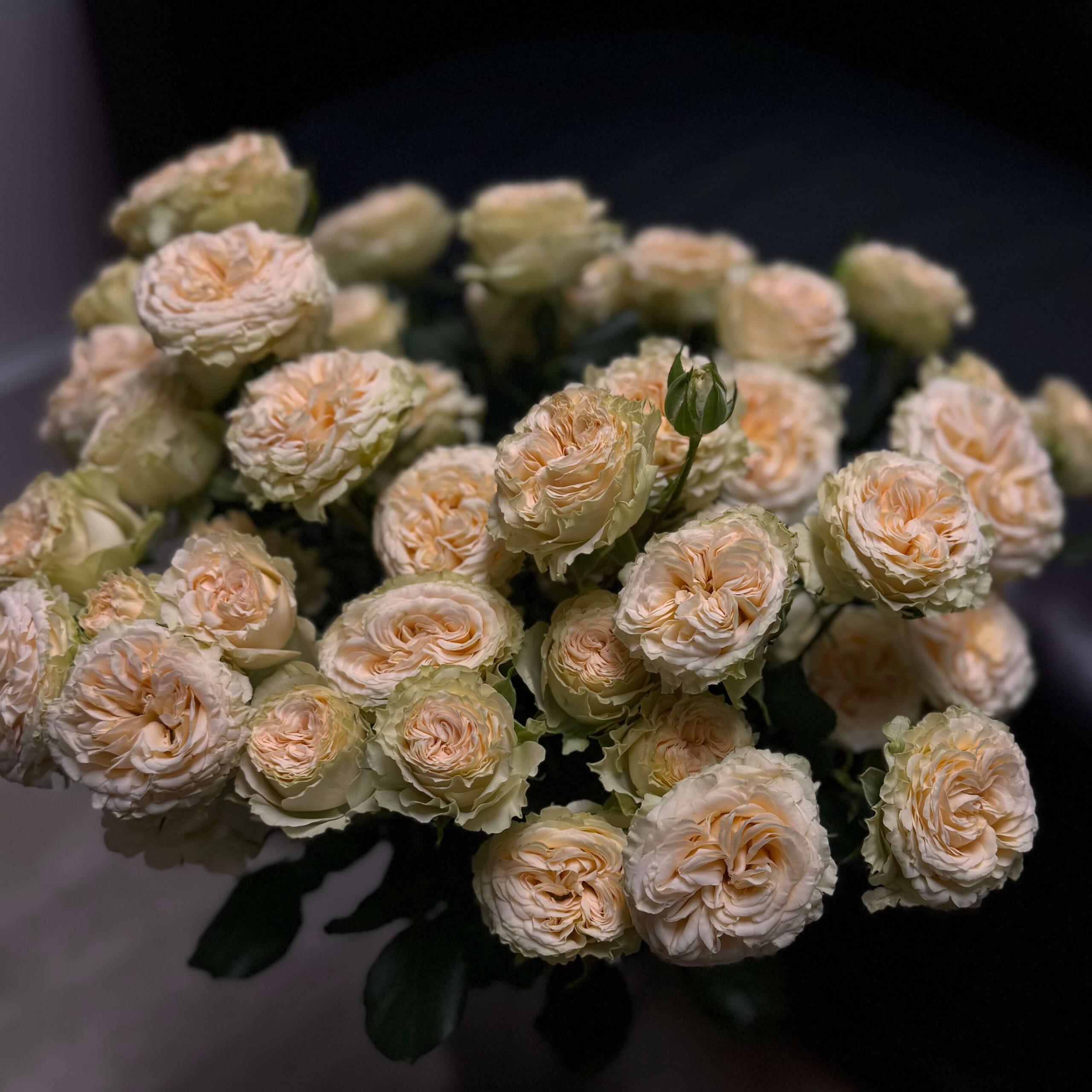 An exquisite premium spray rose that radiates warmth and elegance. The Julieta variety is famous for its stunning peony-shaped blooms and delicate peach-apricot palette. With multiple lush, ruffled buds on a single stem, it creates a rich, voluminous look that is both romantic and sophisticated.