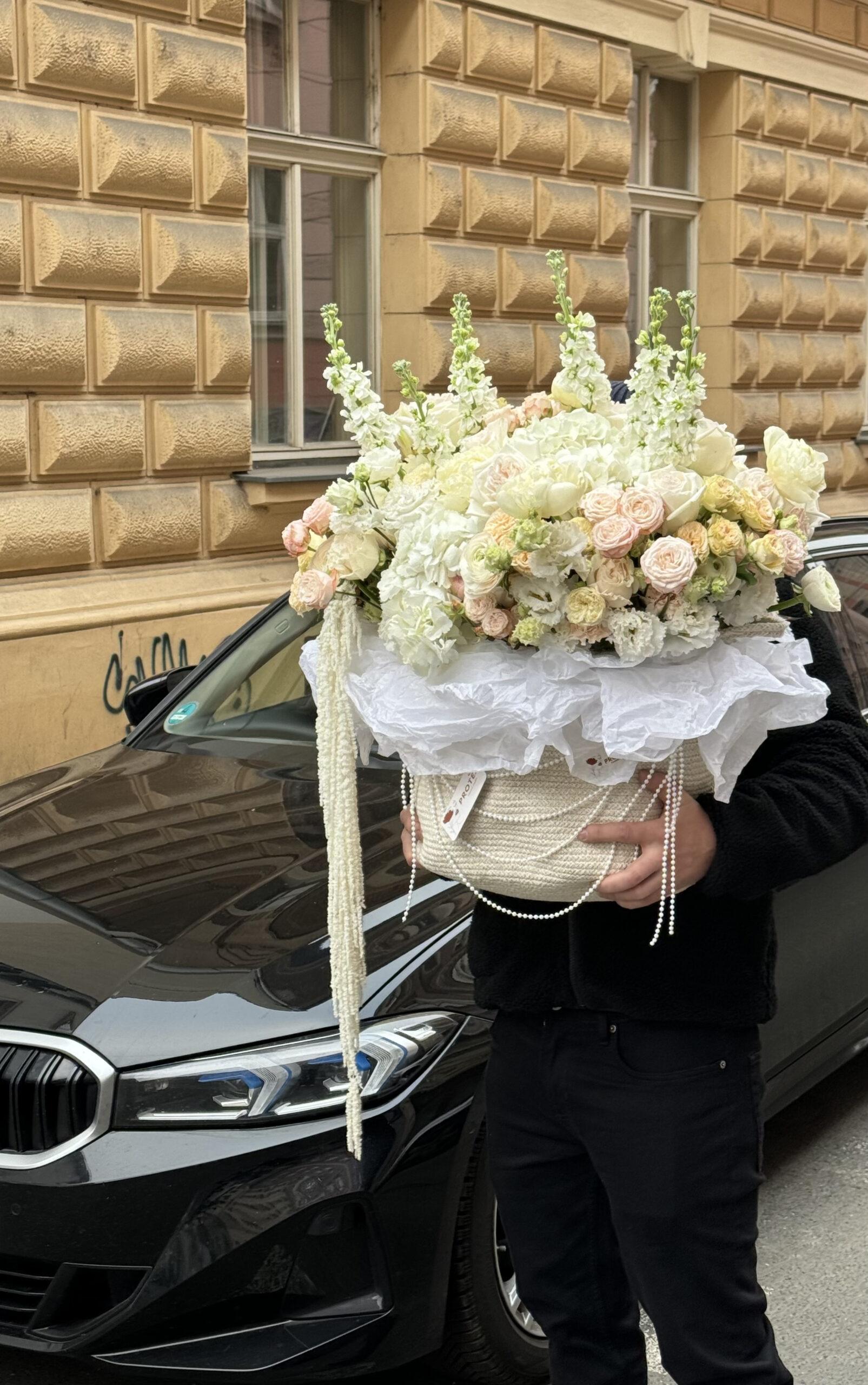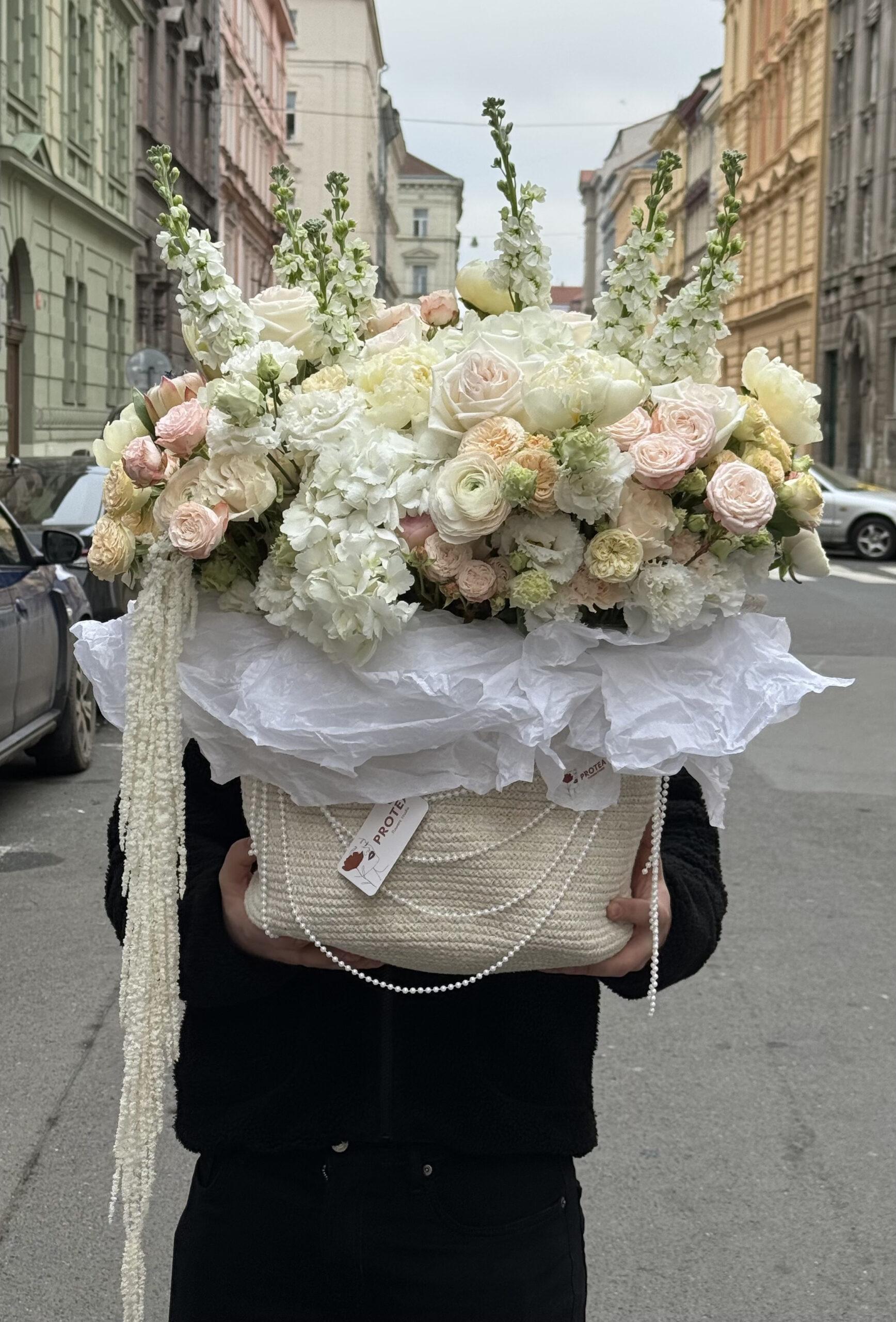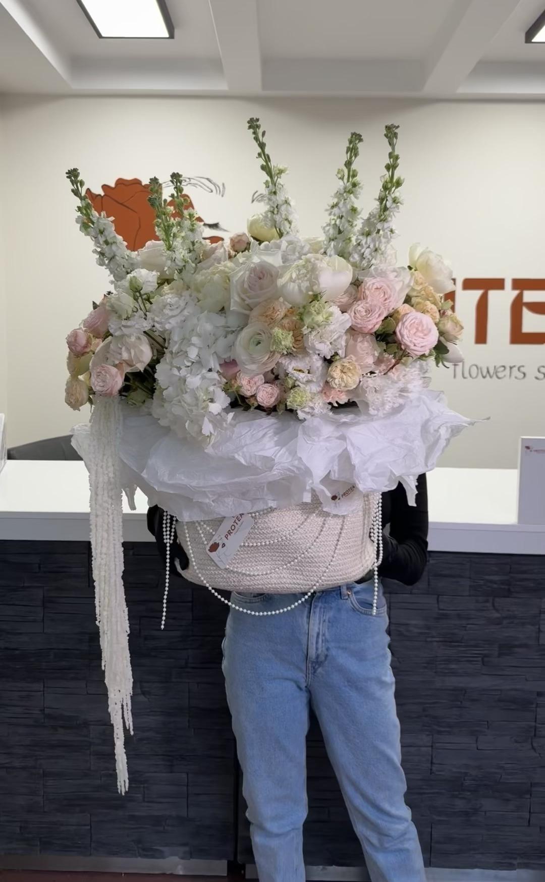 An exquisite author’s composition by Protea, featuring over 10 varieties of premium flowers in soft pastel shades. The arrangement includes proteas, diverse spray roses, peonies, chrysanthemums, and eustomas. This dense composition is crafted with no greenery for volume, with all flowers reaching a height of 35-40 cm. It is presented in a stylish woven bag decorated with pearls.