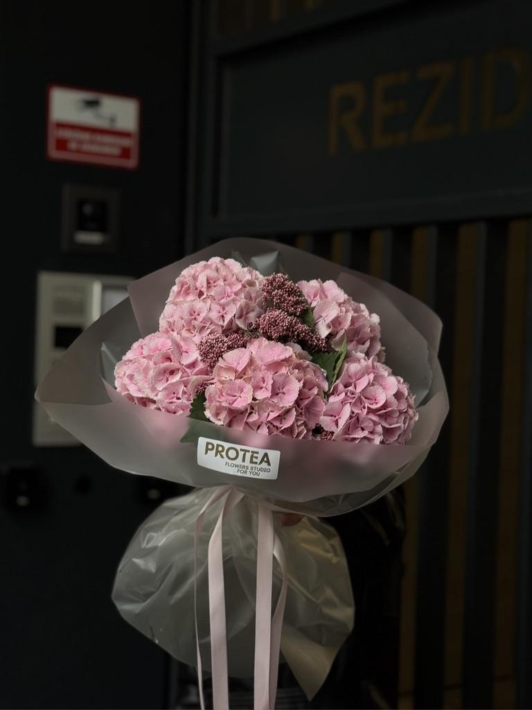A lush, romantic mono-bouquet featuring voluminous stems of pink hydrangea complemented by a contrasting sprig of Ozothamnus (or similar textural filler). Elegantly wrapped in the signature PROTEA Flower Studio style, this bouquet offers a classic yet vibrant statement.