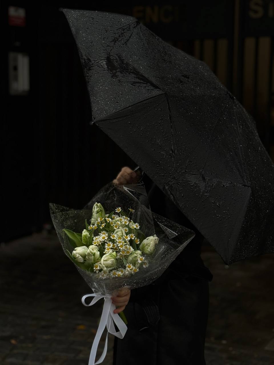 A gentle bouquet combining creamy tulips and delicate chamomile flowers — Pure Morning embodies freshness, simplicity, and natural beauty. Perfect for brightening any day or expressing warm, heartfelt emotions. Wrapped in transparent elegance by PROTEA Flower Studio.