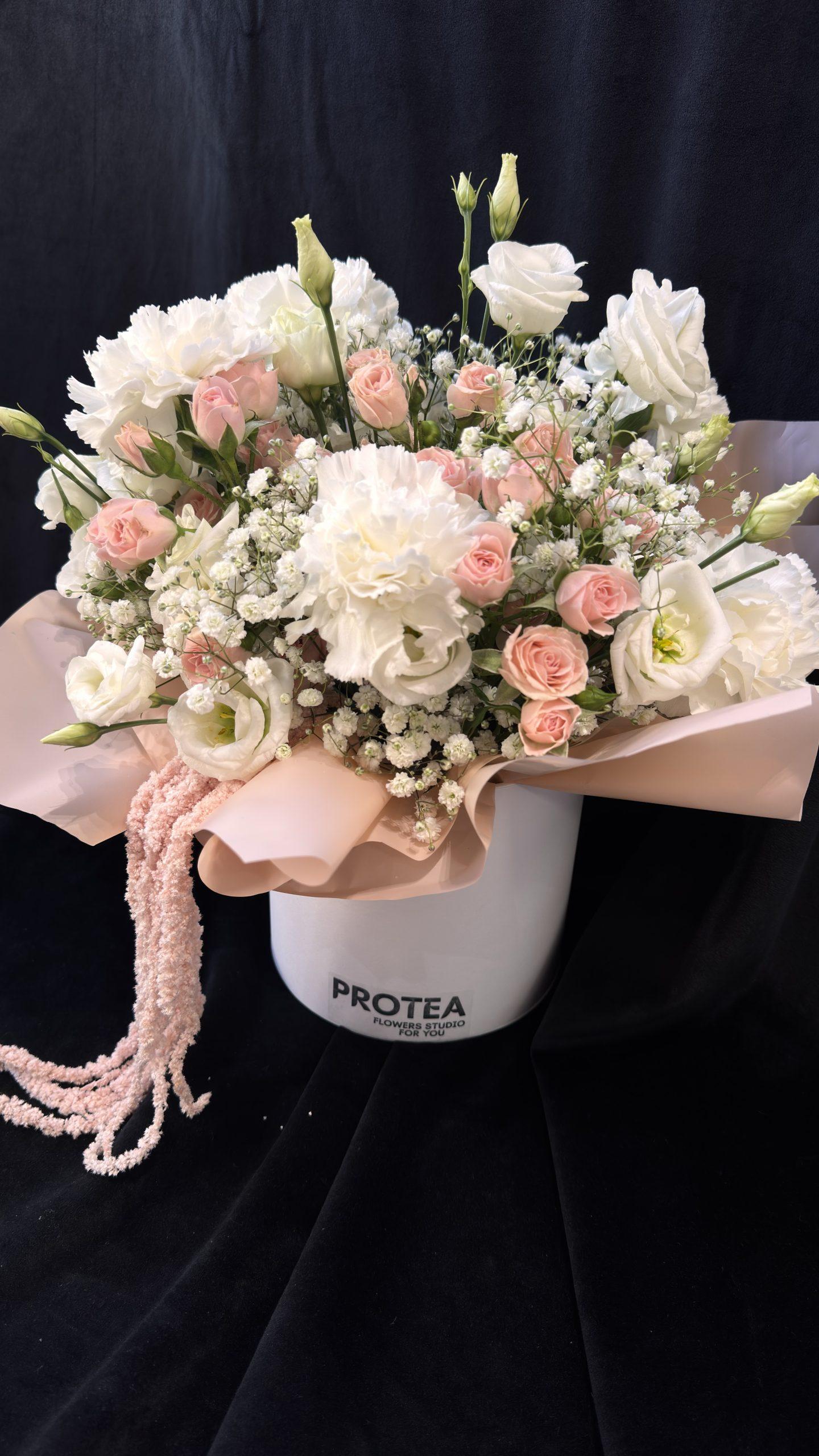 Unikátním detailem jsou splývavé stonky světle růžového amarantu, které aranžmá dodávají ladný a kaskádovitý vzhled. Vše je odborně prezentováno v elegantním bílém kloboukovém boxu v charakteristickém stylu PROTEA.