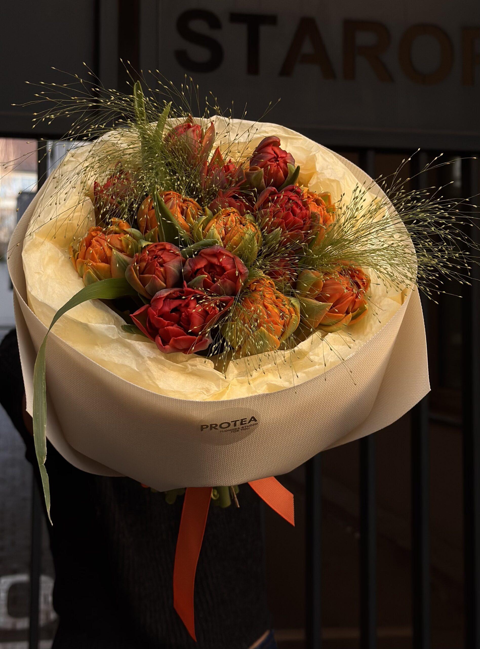 Vibrující a energická kytice Plamenná symfonie je složená ze 17 prémiových plnokvětých tulipánů ve výrazném přechodu oranžových a hluboce červených odstínů. Tyto pivoňkovité tulipány jsou doplněny jemnými pramínky dekorativní trávy panicum, která dodává lehkou a vzdušnou texturu hustým, ohnivým květům.