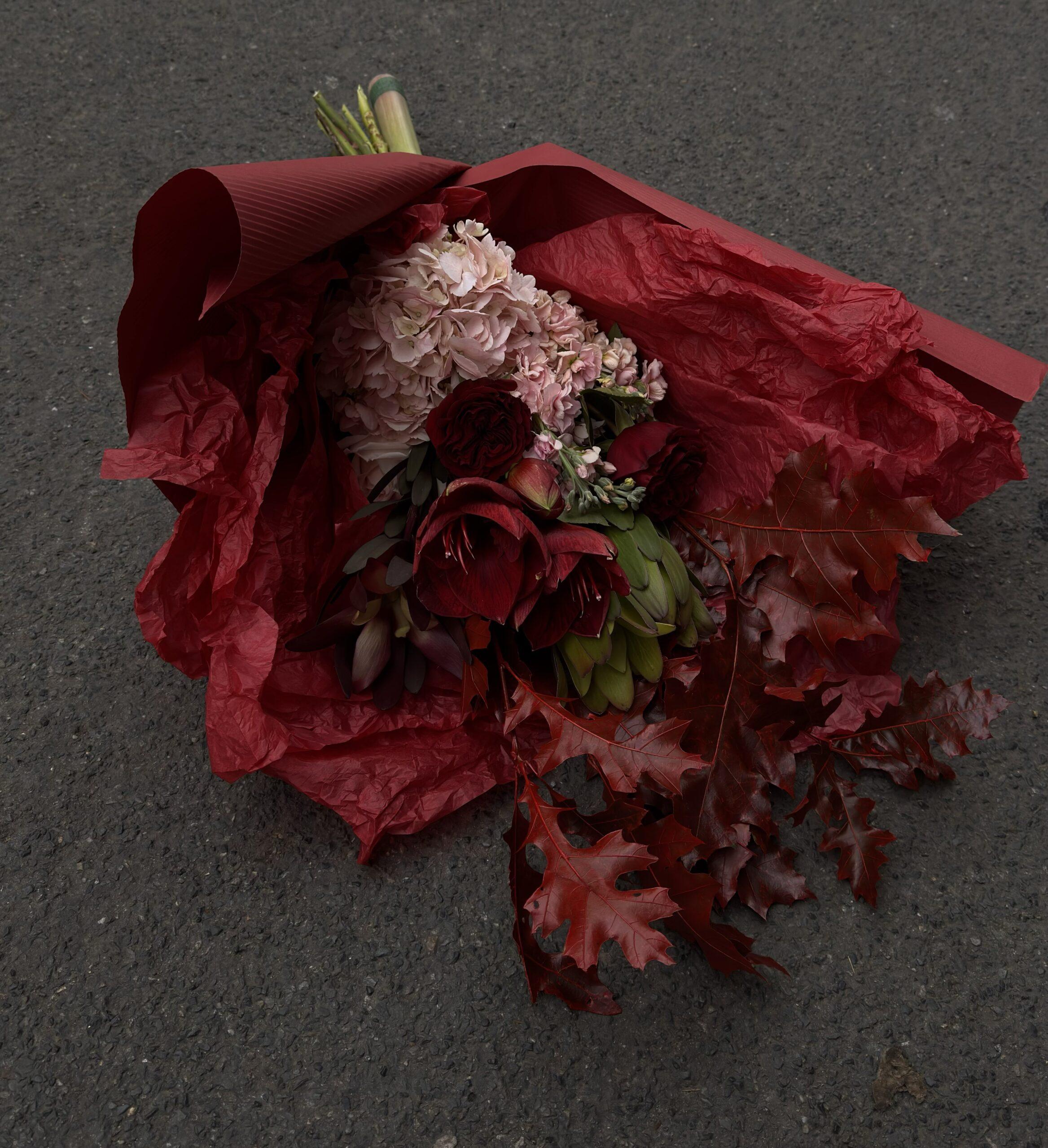 Dramatické a texturované sezónní aranžmá Podzimní karmínová elegance kombinuje hluboce červený amarylis s tmavými sametovými růžemi. Tato bohatá kompozice je obohacena o jemné růžové hortenzie a delikátní matthiolu, které společně vytvářejí sofistikovaný vizuální kontrast.