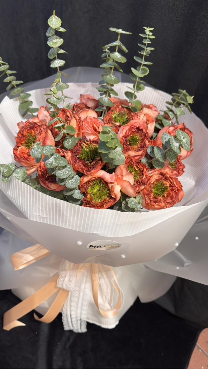 Kompozice je citlivě doplněna vysokými stonky stříbřitého eukalyptu, který zajišťuje elegantní výšku a dodává kytici moderní, vzdušnou texturu. Celé aranžmá je odborně připraveno a zabaleno v charakteristickém elegantním stylu PROTEA, který zdůrazňuje prémiovou kvalitu vybraných květin.