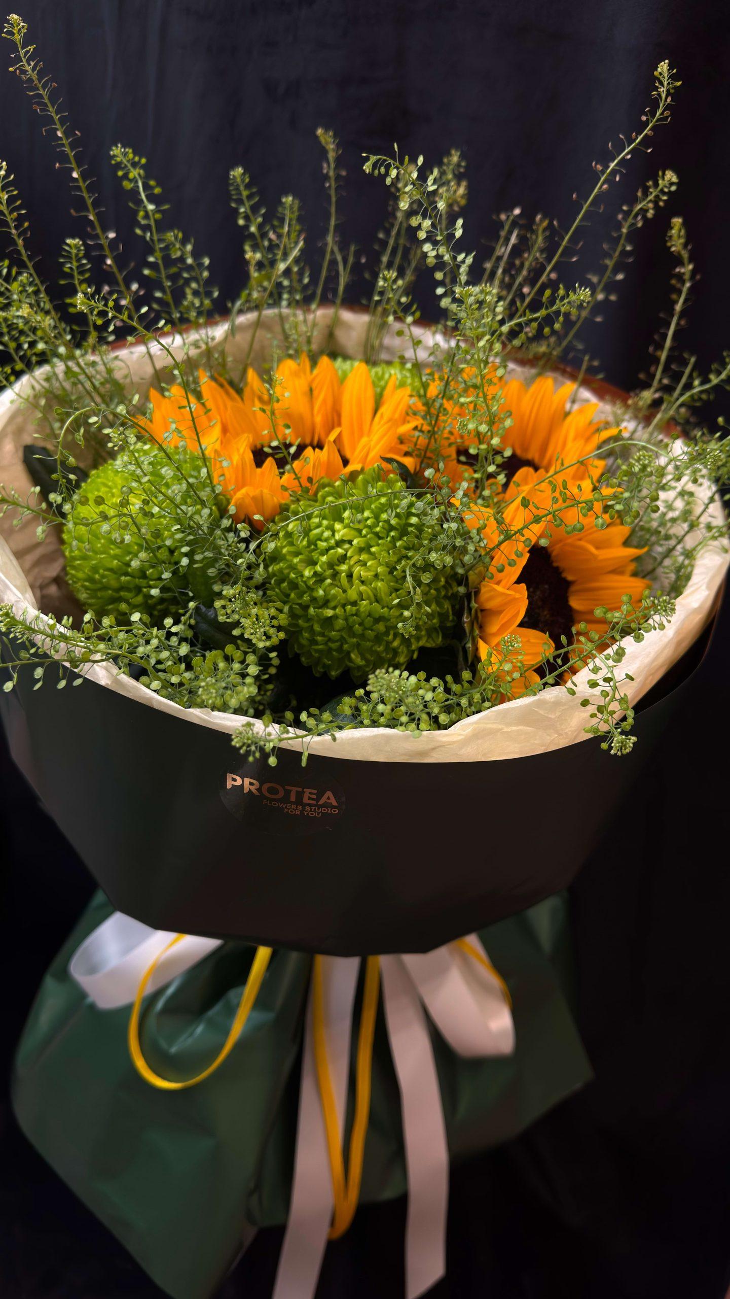 Zářivá kytice Slunečná harmonie v sobě spojuje jasně žluté slunečnice a svěží zelené chryzantémy, čímž vytváří kompozici plnou tepla, radosti a optimismu. Je to ideální dárek, který zaručeně zvedne náladu nebo pomůže vyjádřit vaše nejupřímnější city.