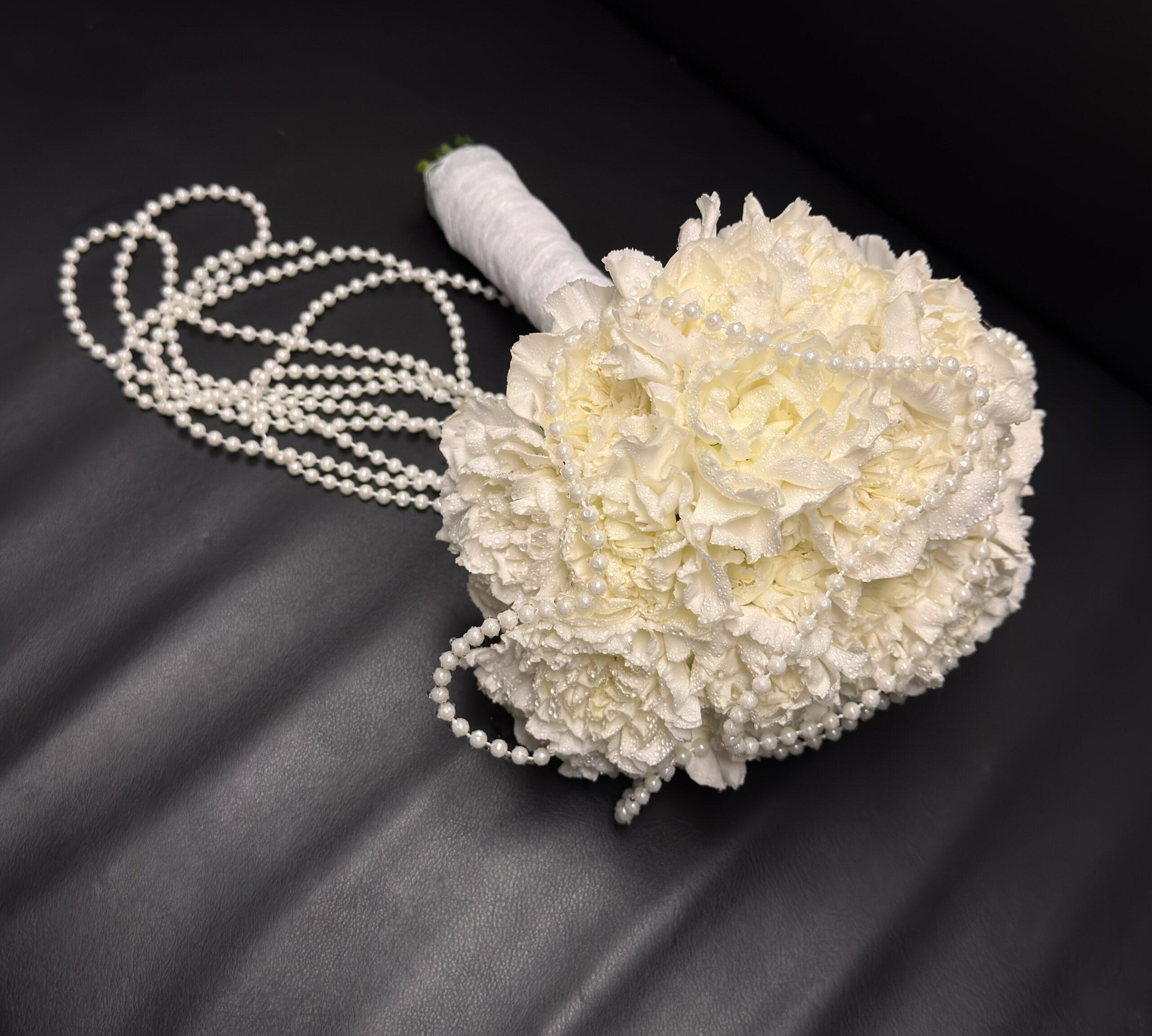 Hledáte elegantní svatební kytici v Praze? Vytříbená a sofistikovaná svatební kytice Perlová oddanost je složená z hustých, jednobarevných krémových karafiátů. Sametová textura květů je elegantně doplněna splývajícími prameny bílých perel, které vytvářejí nadčasový a luxusní vzhled. Toto kompaktní kulaté aranžmá je navrženo jako dokonalý doplněk pro váš svatební obřad.
