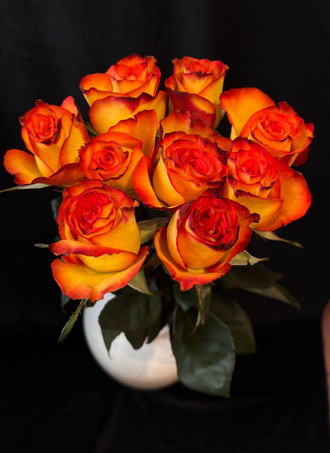 Exkluzivní monokytice dvoubarevných růží v zářivých odstínech žluté, oranžové a červené představuje energickou a nepřehlédnutelnou volbu pro každou příležitost. Každý květ těchto růží v sobě nese unikátní přechod barev, který dodává aranžmá hloubku a dynamiku.