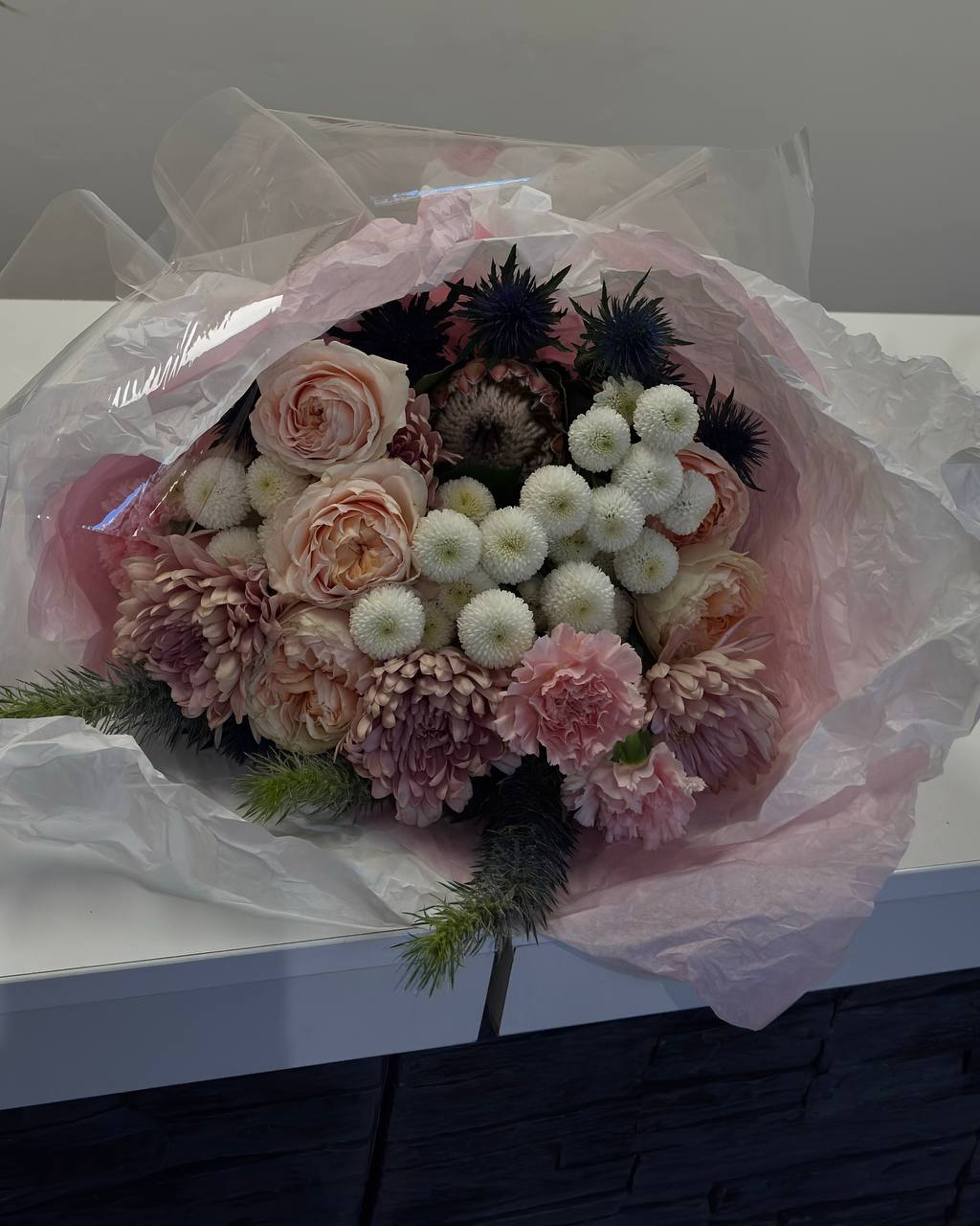 Unikátní a stylová kytice. Kombinace královské protey, něžných růží, drobných chryzantém a eryngia. Elegantní dárek plný zajímavých textur a moderního stylu.